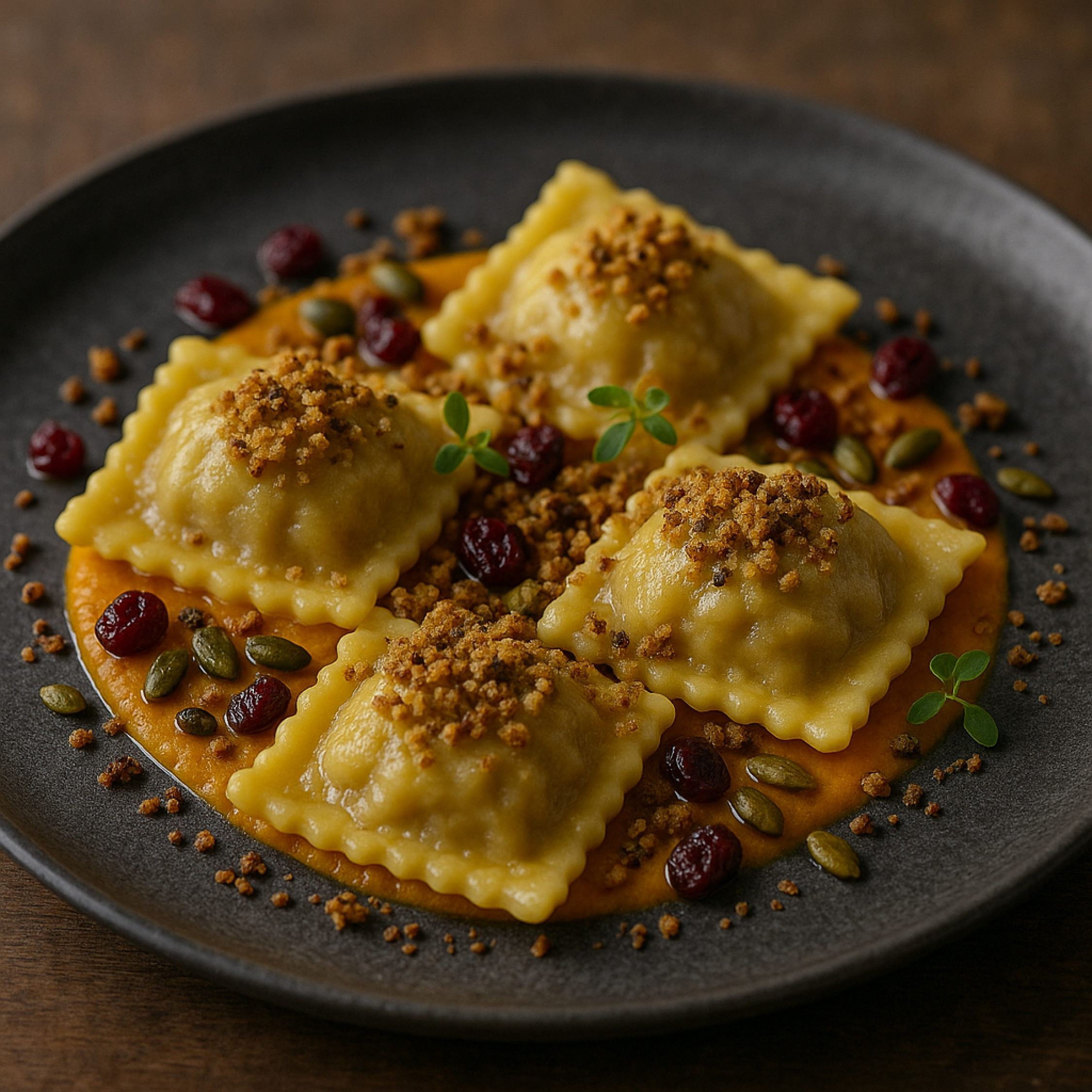 Ab 16. September in der Brasserie Süsswinkel: Hausgemachte Wildfleisch-Ravioli, serviert auf einem samtigen Kürbis-Ingwer-Püree, verfeinert mit fruchtigen Cranberrys und einem knusprigen Kernen-Crumble. Eine Kombination aus herzhafter Fülle, leichter Schärfe, süss-säuerlichen Akzenten und knackigem Biss – genau so, wie wir den Herbst lieben.